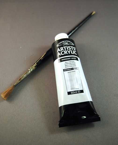 Para añadir un brillo, utilicé pintura acrílica blanco iridiscente. Pinte una capa muy fina directamente desde el tubo en un pincel seco, y esto dio lugar a mancharse de tinta muy poco.