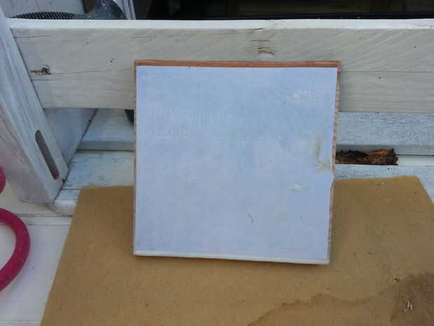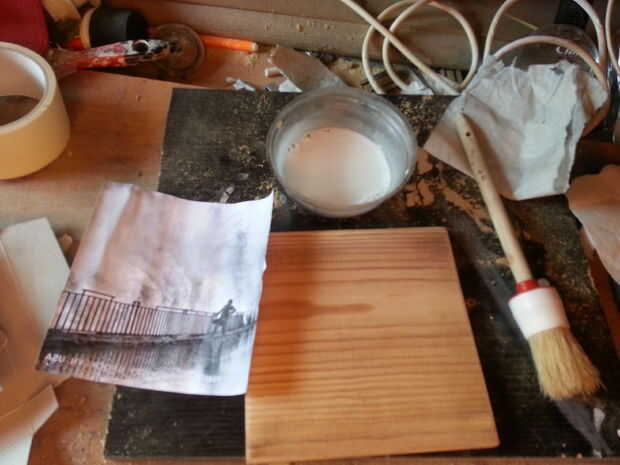 Coller la foto côté sur recto le bois grâce a la mezcla colle de moitié moitié eau. s'assurer de ne laisser aucune bulle. laisser le tous sécher.