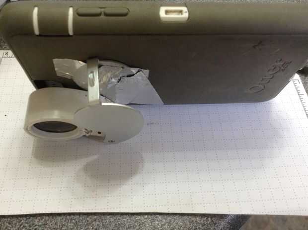 Tome una lupa de 40 x 25 mm y ponerlo delante de cámara, asegúrese de que se sujete firmemente contra el teléfono, tomar fotos de objetos pequeños, después usted puede acercarse a ellos, así! Funciona muy bien para astillas y pequeños bugs en plantas.. .la pequeña foto es sin lupa y la más grande es con lupa th! y el último es el zoom!