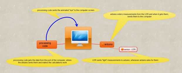 Después de obtener una imagen de ojo de internet, lo que hice es, con un círculo negro de procesamiento (y también relleno negro el área dentro) que tiene un radio inversamente proporcional a la cantidad de luz que recibe de la LDR. Por lo que la gráfica del iris aumenta a medida que la luz disminuye (tal como un diafragma verdadero!). No hay ninguna analogía precisa para el funcionamiento del iris real, aunque no puedo imaginar - en caso de los datos correctos eran disponibles, por qué, no debería ser posible!