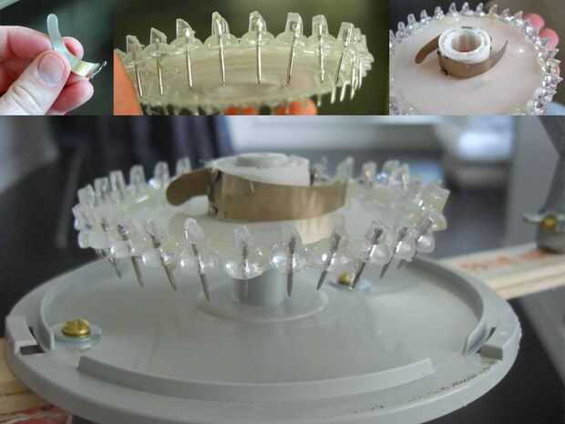 Luego caliente pegué las clavijas de empuje modificada hasta el borde exterior de la bobina, estos forman los 'dientes' que le paso el carrete adelante finalmente a la leva de la pluma.
