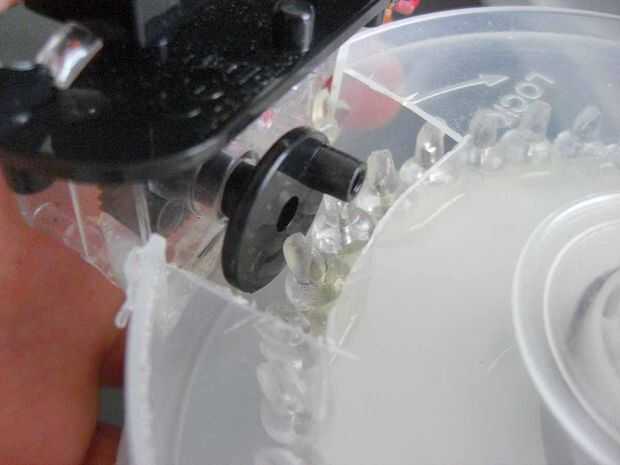 La leva fue hecha de una lengua de metal pequeño en el cassette de vhs. La lengua es la curva se ajuste alrededor de la bobina de cinta con el extremo cónico que sobresale. La cam fue pegada a la rueda interior del carrete y doblada en la posición.