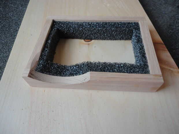Para solucionar estos problemas vamos a construir un soporte de cámara que es esencialmente una pequeña caja con acolchado en los cuatro lados que se adapta perfectamente a la cámara. Comienza por cortar unas tiras de madera que están sobre la misma altura que el ancho de la cámara, (3/4" a 1" según la cámara) y aproximadamente 3/8" a 1/2" ancho. Una vez que tengas tus tiras de la madera, crear un cuadro que es aproximadamente 1/2" más grande en todos los lados de la cámara por cortar y pegar las tiras. Después el pegamento se haya secado corte e instalar la espuma en el interior de la caja para que la cámara se ajusta cómodamente a la montura.