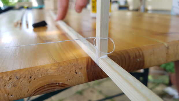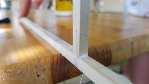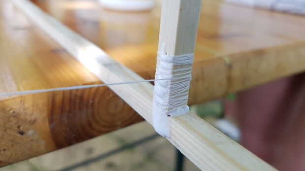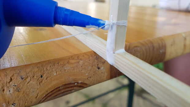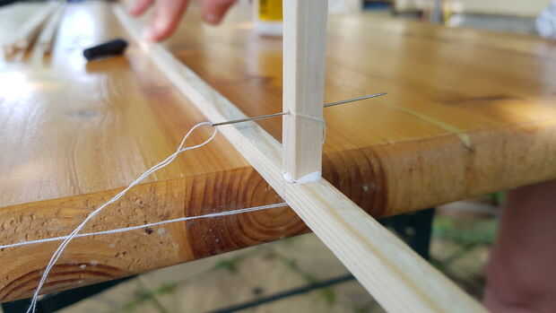 Ahora, la aguja a través del agujero y repetir muchas veces. Viento un hilo alrededor y pegamento con el pegamento de madera encima de todo.
