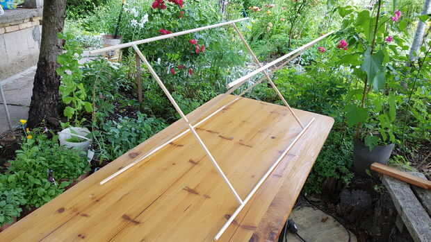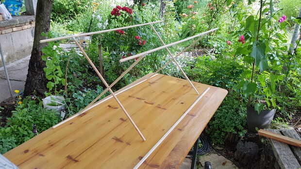 Terminar el armazón por unir todas las piezas largo y dos cruces. Uso un montón de hilo y pegamento en cada unión para asegurarse de que soportarán los vientos!