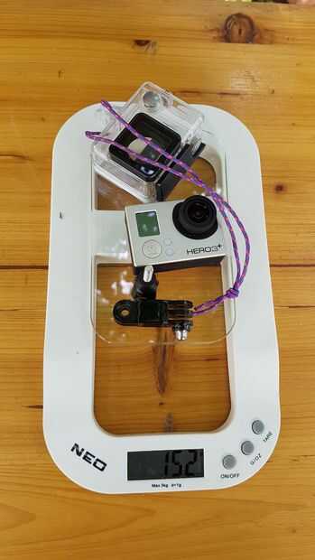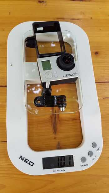 Poner la cometa en la escala. Mina lee sólo 231 gramos! Es como dos GoPro (sin la caja submarina).