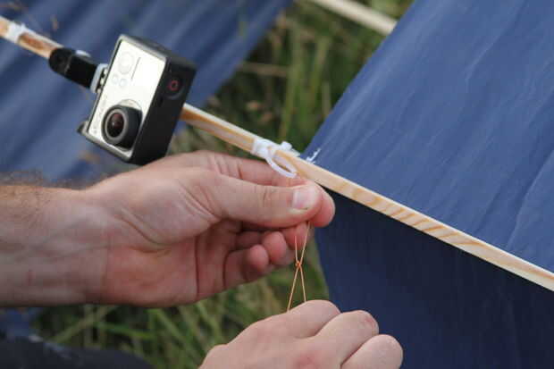 esto es una manera fresca para convertir su cometa stunt en un ala delta. Necesita una cometa de rogallo truco mío tiene una envergadura de 24 pulgadas que es bastante para levantar una micro cámara. Esto es genial para fotografía aérea.Paso 1: Fijar