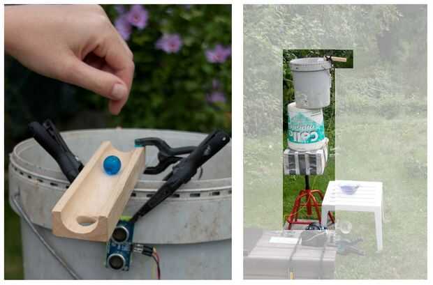 Para llegar a una altura suficiente que deje caer la canica, había acumulado cosas y montados el camino en ella. Asegúrese de que esté lo suficientemente estable para permanecer estática de una gota a otra.