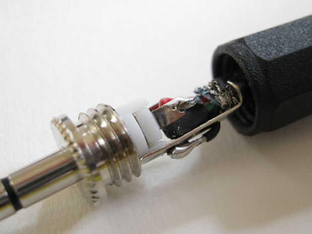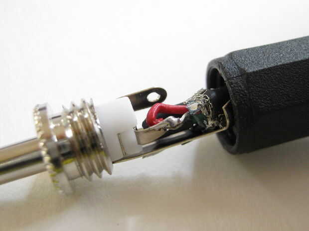 Tenía un enchufe estéreo y jack y decidido a enchufar el cable y el conector para el Arduino. Esto hace que sea fácil de conectar y me impide invertir accidentalmente los contactos. Ver ADVERTENCIA más abajo. Un multímetro es esencial verificar que las conexiones correctas y nada se pone en cortocircuito.