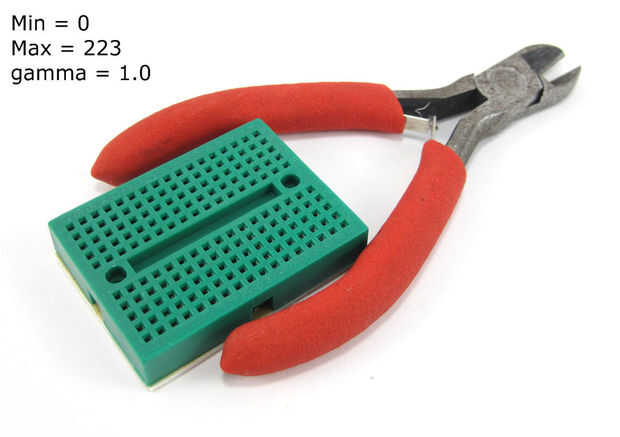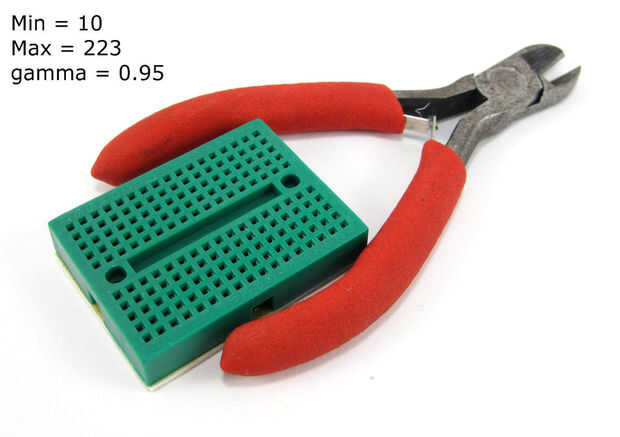 Ben Finio proporcionó un Consejo útil si usted está encontrando su imagen para estar más expuesto. En el paso-7, en ventana de colores -> niveles , aumentar el valor del triángulo de la izquierda a alrededor de 10 para reducir la exposición excesiva. También puede reducir el valor del triángulo medio (también conocido como gamma) a alrededor de 0.95 para obtener una imagen de mejor aspecto. Estos valores fueron utilizados por él y he probado a trabajar bastante bien. Las 3 imágenes de protoboard verde con cortador de alambre también son proporcionadas por él.