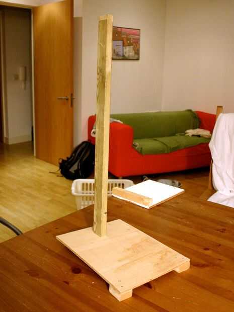Luego corte una longitud de listón. Mina era aproximadamente de 70 cm de largo, pero cortó a uno como que necesita (si es demasiado largo que se necesita una base más grande y más pesada estable apoyarlo). Taladro y tornillo a través de la capa base en el extremo de la madera. Tenga cuidado de conseguir derecho!