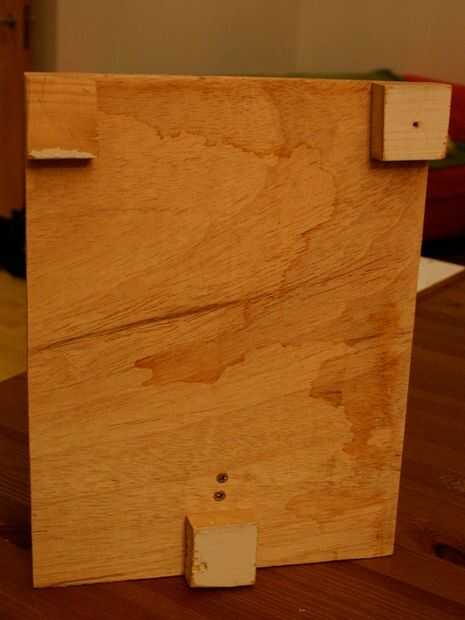 Cortar un trozo de contrachapado de 12mm de la misma medida base de la lámpara. Como mi capa de 12mm fue muy deformado he añadido tres pies para permitir que soporte estable. Se trataba de tres plazas de 20 mm x 40 m m listón atornillado a la base con tornillos de 15mm.