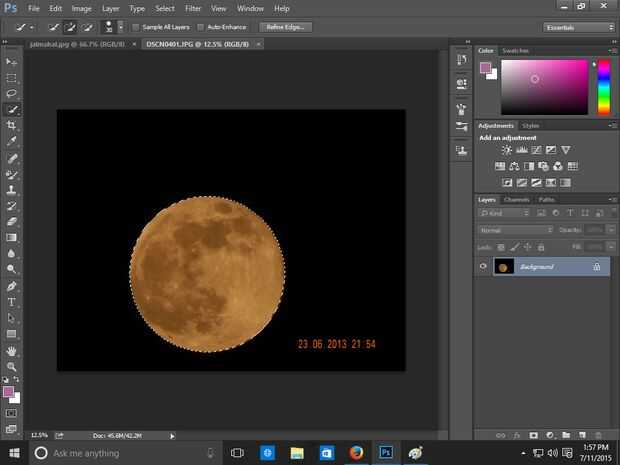 Después de tomar la herramienta de selección rápida que tienes que hacer clic en la luna y arrastre el ratón mientras se mantiene a la izquierda haga clic para seleccionar la luna completa