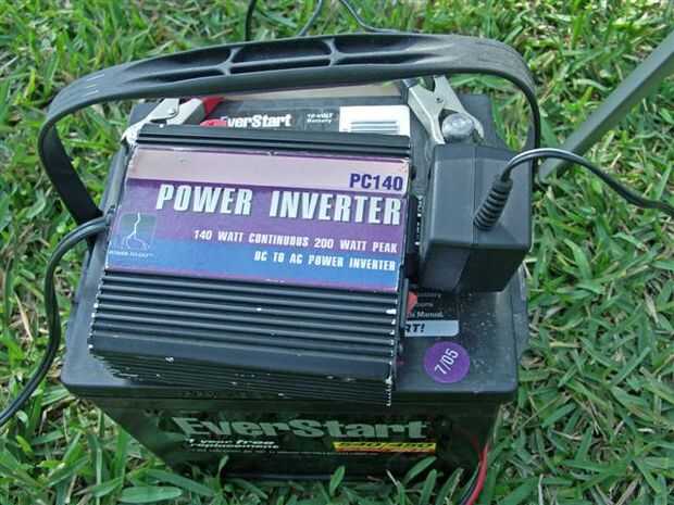 Así que empecemos. Primero encontrar una batería de 12V (tal vez de un coche o un tractor de césped) y conectarlo a un 12V DC a 110V AC inversor. En palabras de Snap!, "Tengo el poder!".