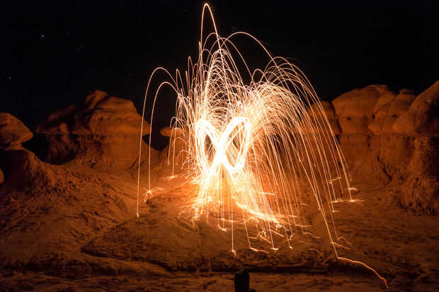 Consejo: Si puede establecer la velocidad de obturación al modo"bulbo" se puede mantener el obturador abierto como usted quiere. Si tienes un amigo que hace girar la lana de acero, puede presionar el botón del obturador cuando las chispas empezar a volar y luego suelte el obturador cuando deje de girar. ¡Buena suerte!