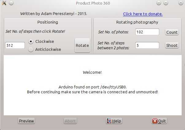 Antes del primer uso del programa producto foto 360 tienes que instalar el script productphoto360_stepper.ino en el Arduino. (Descargar el archivo desde el enlace de más abajo...)
