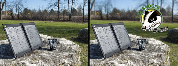 Para implicar que tal vez el tiempo estaba un día parcialmente soleado, parcialmente nublado, usé una botella de spray de agua para rociar una niebla de agua sobre el panel solar. Puesto que los paneles solares funcionan cuando es soleado, pero éste también está diseñado para ser resistente al agua, estaba tratando de usar las fotografías para ayudar a contar esa historia. «Tal vez el dueño de este panel solar salió senderismo y quedó atrapado en una tormenta, pero ahora es soleado y puede cargar a su GPS. Bueno adquirió el PANEL SOLAR de tejón impermeable USB!"