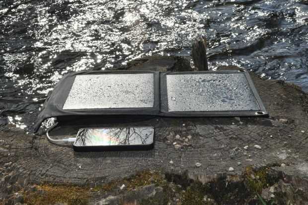 He arreglado el panel solar sobre una roca, apoyado por el panel solar con una abrazadera de resorte y colocado varios accesorios, como un equipo GoPro cámara o tableta, cualquiera de los dispositivos, que el panel está diseñado para cargar con él.