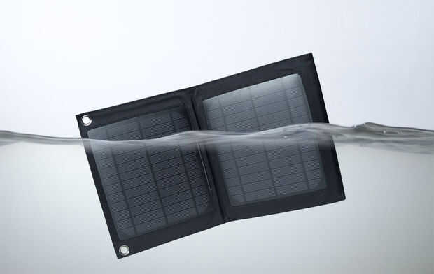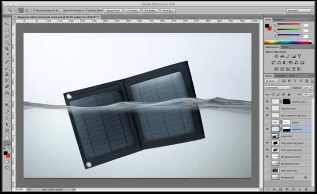 Combiné la toma del producto, el fondo del acuario y una ola para crear una imagen compuesta del panel en el agua. Creo que resultó bastante bien. Es muy estilizado, y el panel solar se ve casi como un gráfico! Por otra parte, no tiene el realismo de las fotos que tomé de simplemente tirar el panel solar en el acuario. ¿Que prefieres? ¿El compuesto o la foto "en vivo"?