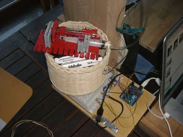 Puesto que era muy engorroso tomar fotos así, decidí añadir una jeringa motorizada para producir las gotas. Por suerte tengo un conjunto de Fischer Technik que es ideal para la construcción de prototipos. Con unos ladrillos y cog ruedas creé una prensa de jeringa que permite crear un montón de gotas algo precisamente. Pero por supuesto la forma manual no lo que iba después. Necesitaba a conseguido para "The Full Monty".