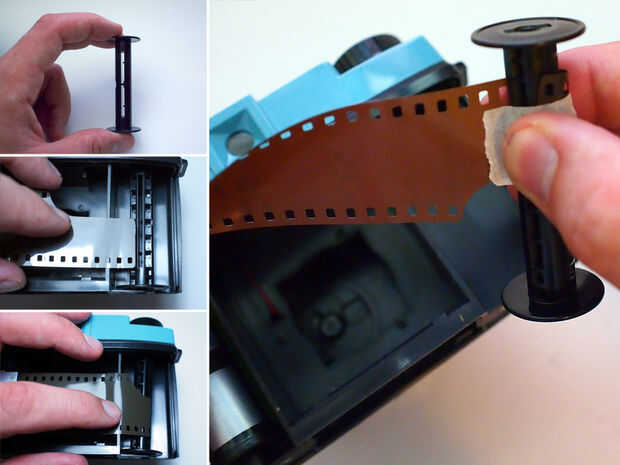 Cargar la película boca abajo (para que la tapa de la pluma quede hacia arriba) hace que la instalación simple y no se requiere de ninguna modificación a la carcasa de la cámara. Tirar de una sección de la película del rollo y lo alimentan a través de la ranura en el eje de captación. Estos ejes tienen un pequeño diente dentro de la ranura las capturas de la película de formato medio, que también puede utilizarse para atrapar un agujero de la rueda dentada en la película de 35mm. Opté por utilizar una broca pequeña de cinta adhesiva para fijar la película en el eje de captación, por si acaso.