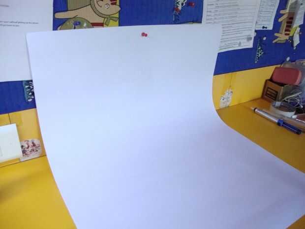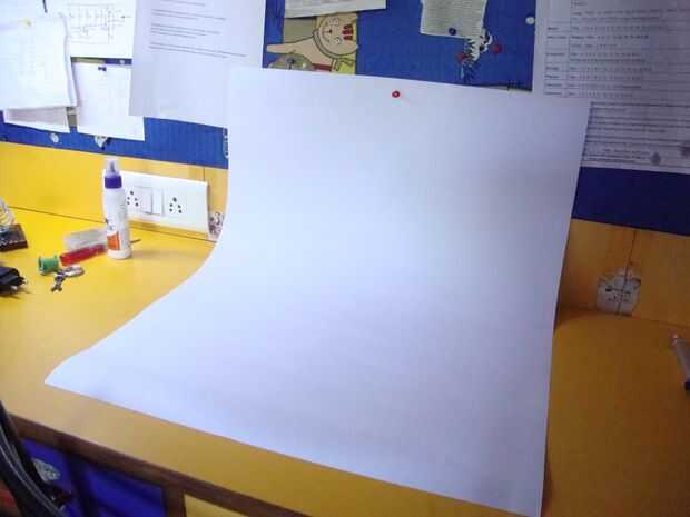 Así que termine de hacer sus propias luces de fotografía! Ahora es el momento para tomar algunas fotos con él. Empieza por tomar fotos con fondo blanco primera. El primer paso para ello es preparar el fondo para tomar fotos. Para ello, toma una hoja grande de papel blanco. Coloque sobre la mesa como la imagen de arriba - pie perpendicular a la base de la tabla. No la doble pero mantener de tal manera que se encuentra inclinado sobre la mesa. Asegúrese de que su papel no tenga ninguna marca que puede disturbar el fondo y llevar a malas fotos.