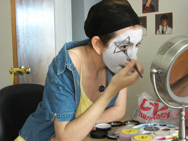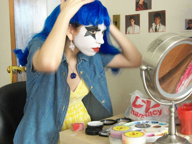 Ahora, una vez que usted decide qué personaje quiere posar para la cámara, vas a armar tu disfraz y hacer su pelo y maquillaje. Me encanta siempre la cara la pintura y el uso de maquillaje. Por lo tanto, en este ejemplo, estoy haciendo una mezcla de Katy Perry y 'KISS Paul Stanley con la peluca azul y el negro y blanco maquillaje de estilo Kabuki. Por lo tanto, si eres fan de Katy Perry o beso, este es para usted! Para mi traje, como estás viendo, llevo una chaqueta de jean azul de manga corta, sobre un vestido de la correa de espagueti amarillo.
