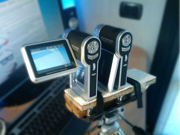 Este método funciona muy bien para los temas que siguen. Pero si desea capturar imágenes 3D de objetos en movimiento, se necesita algún hardware adicional. Si tiene dos cámaras, puede construir un sencillo Aparejo de dos cámara que monta sobre su trípode. En este tipo de configuración, las cámaras se montan 2,5 pulgadas aparte de centro a centro. Para ver un buen ejemplo, Echale un vistazo esta plataforma por ciscu92 usuario. Entonces al tomar la imagen, necesita activar ambas cámaras al mismo tiempo.