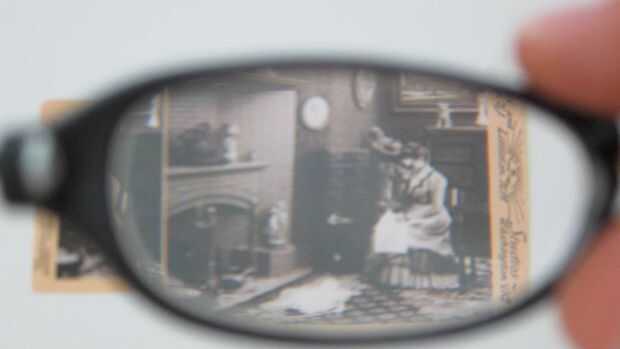 Para utilizar su nuevo estereoscopio, mantenerla hasta su cara con los templos y el perno sobresale en el lado que está más cercano a tu cara. Posición para que las lentes son aproximadamente dos pulgadas de sus ojos. Entonces sostenga la tarjeta de stereograph unas 12 pulgadas lejos de su cara. Usted probablemente tendrá que hacer ajustes para hacer es más fácil ver basado en tus ojos y las lentes que están trabajando. Jugar con el espacio entre los ojos, las lentes y la tarjeta. También puede ajustar el espaciado entre las dos lentes. He encontrado que los templos pueden ser espaciados dondequiera a partir 1/4" aparte aparte de 1" y todavía funciona. El espacio que utilices dependerá de cómo lo que usted encuentra más cómodo.
