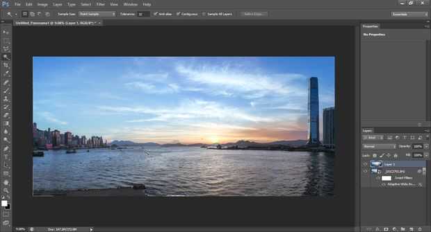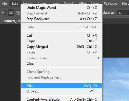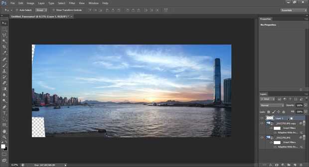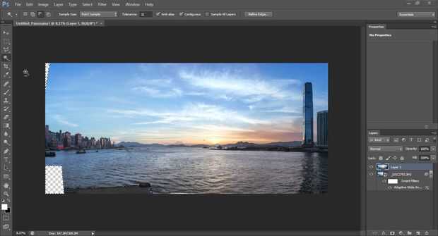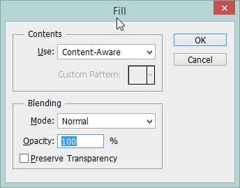 Haga clic en Editar -> rellenar. Seleccionar Contenido y haga clic en Aceptar. Esto llenará las áreas vacías mediante el análisis de las otras partes de la fotografía para crear un parche algo transparente de píxeles.