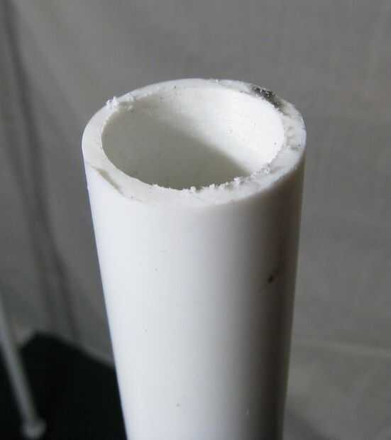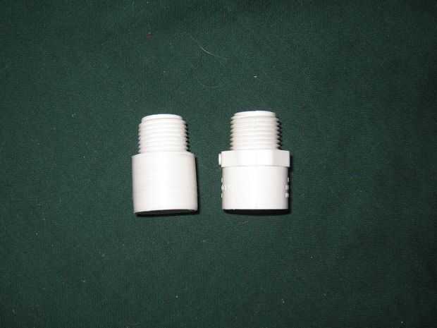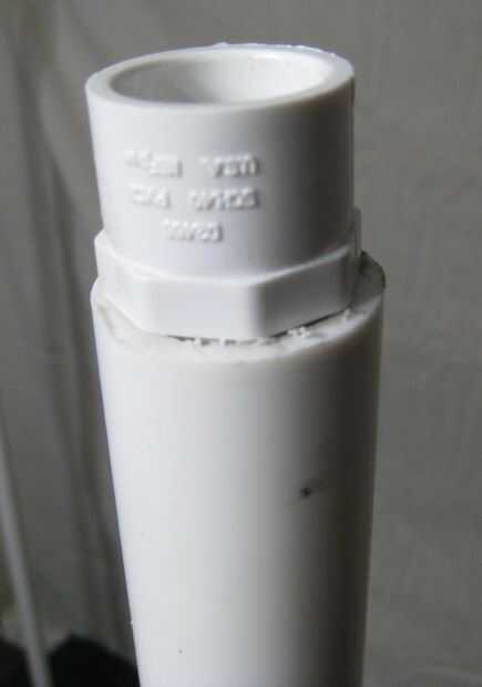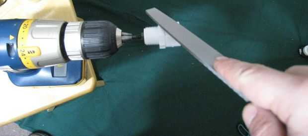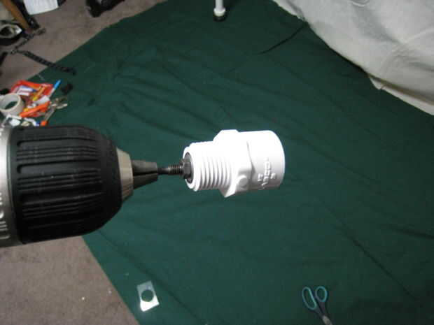 Inserte un taladro para girar el adaptador y usar una lija o a hasta aproximadamente 1" de diámetro. Está bien si ha afilado un poco, mientras el lado más pequeño hacia las roscas macho. Girar hasta que encaje justo en el tubo de PVC.