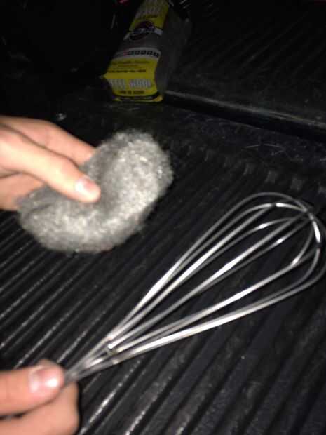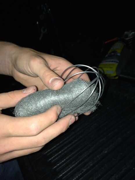 Primero lleva lana de acero y sepárelos ligeramente. No cualquier rip off, solo lo Afloje para arriba. Esto lo ayuda a grabar mejor. A continuación rellene la lana de acero dentro de la boca. Último lazo de la cadena hasta el final de la varilla. Usé unos 3-4 pies de cadena. Diferentes longitudes dará resultados diferentes.