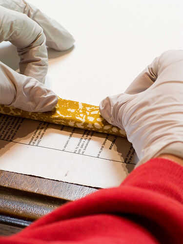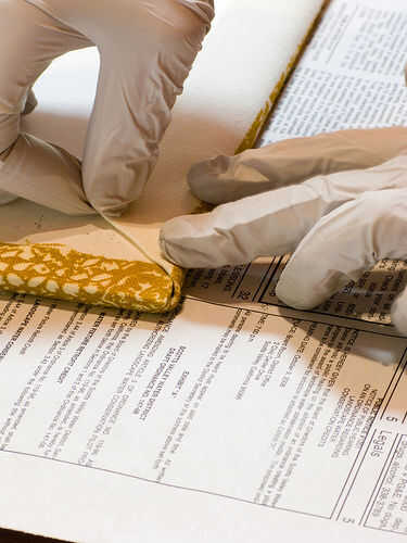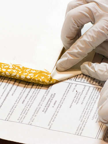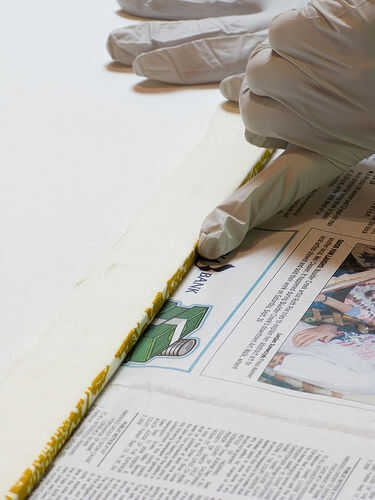 Suavemente envuelva a la tela alrededor del borde (puede que tenga que esperar un minuto hasta que el adhesivo se vuelva pegajoso).