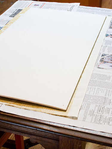Una vez que el borde quede bien adherido, la vuelta del todo sobre y adhesivo en aerosol por todo el tablero de base de espuma. Alise la tela tan se centra, colocar de nuevo si es necesario.