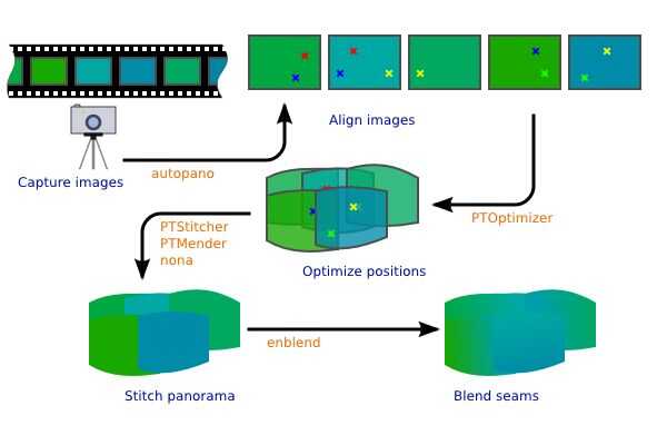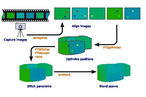 5. coser la imagen. Es donde ocurre el verdadero trabajo. El programa stitcher toma las posiciones de la imagen previamente calculado y reasigna cada píxel de las imágenes de entrada de su proyección original a donde debería de estar en el panorama final. El resultado será una imagen combinada o una serie de imágenes, cada que contiene píxeles de exactamente una imagen de la fuente, para ser mezclados más adelante.