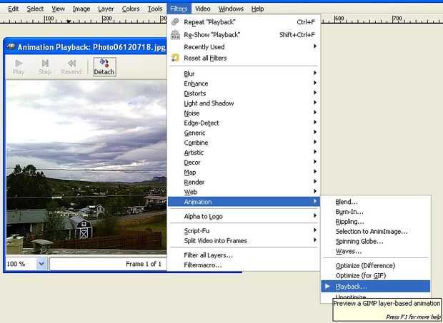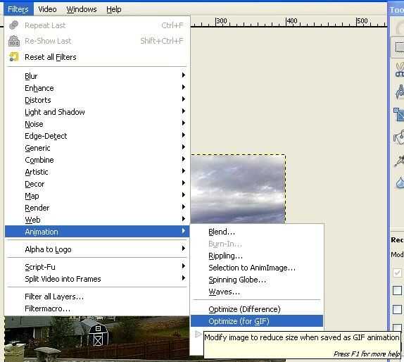 Para optimizar mejor el tamaño del archivo, puede seleccionar en el menú "filtros > Animación > optimizar (para GIF)" y se vuelva a procesar cada capa para la conversión a un archivo GIF. Esto abrirá una nueva ventana. Para asegurarse de que la animación se ve correcto, seleccione en el menú "Filtros > Animación > reproducción..." Se abrirá una ventana de vista previa para mostrar más o menos cómo se verá la animación.