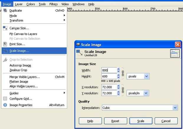 Para mis propios propósitos, sólo debían escalar hacia abajo. Seleccione en el menú "Imagen > escala imagen..." Un buen entorno para esto sería 800 x 600 o menos. Si la imagen es demasiado grande, tu computadora será lenta al tratar de cargar más tarde.