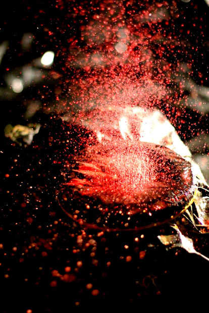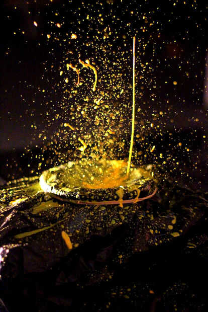 Dos canciones con una fuerte línea de bajo. Dos fotógrafos. Cinco personas de tecnología. Un grupo mixto que van de ocho a cincuenta años de edad algo. Un equipo de música donado. Una cámara, bolsas de basura. Una luz prestada. Una sala de reuniones de la biblioteca pública. Poco de pintura, agua y una banda de caucho. Esto es cómo nosotros (rampa - aleatorio acceso Maker) danza pintura.