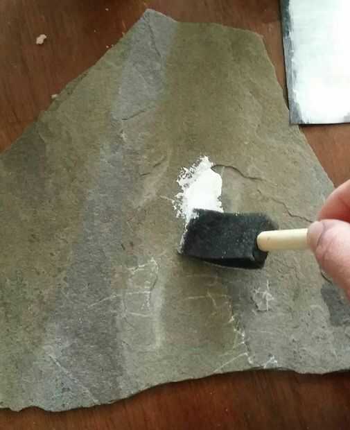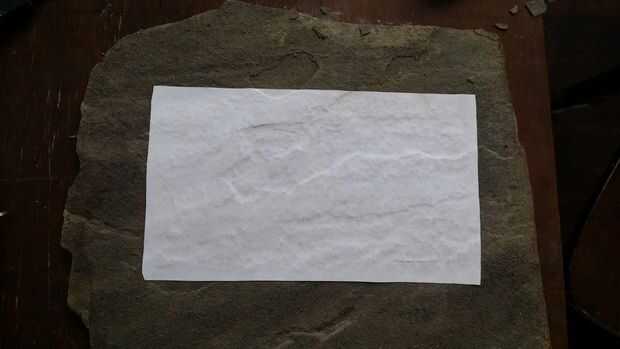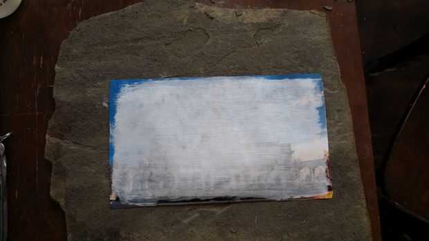 Con cuidado coloque la foto boca abajo sobre la piedra (o lo que usas) y frotar va desde el centro hacia fuera para soltar burbujas y adherirse uniformemente. Ahora tienes que pulir la imagen; muchas personas usan la parte de atrás de una cuchara para esta parte, pero pues yo estaba transfiriendo sobre piedra que tenía un par de puntos sharp que usé mis dedos para evitar desgarros a través del papel, esto también hace más fácil de conseguir en las grietas y crestas. Cuando esté satisfecho, tomar un paño húmedo y seque ligeramente sobre el papel hasta que pueda ver la imagen a través de él. Ahora todo lo que tienes que hacer es esperar a que se seque (el medio de transferencia, no el agua) Esto tomará de 8 a 24 horas.