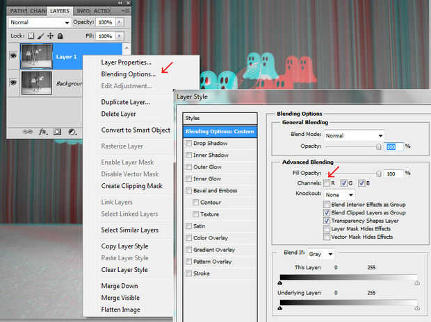 3. Haga clic derecho la capa superior: mezcla mezcla opciones/avanzado / desmarcar el canal rojo. La capa inferior se queda solo.