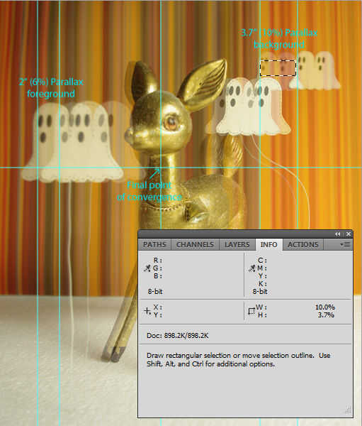 3. tiempo de tomar algunas medidas. En el plano más cercano y más lejano fondo observado anteriormente encontrar un elemento en cada uno que es prominente, algo visible en las capas de derecha e izquierdas. En las fotos muestra los ojos en la parte delantera y trasera ghost hacer buenos objetos para medir. A medida:
