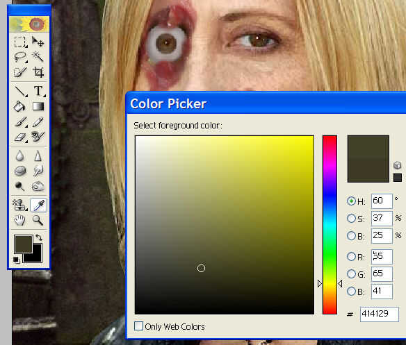 Asegúrese de que la capa de fondo es visible y con el cuentagotas, encontrar un color musgo agradable para aplicar a nuestro zombie. Buscar las lápidas en el cementerio, algo está obligado a subir.