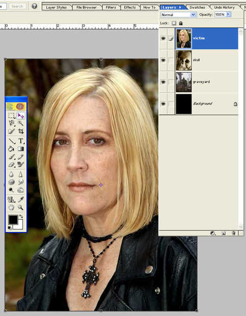 Abra el archivo de su víctima, seleccionar todo y copiarlo. Ahora abra un nuevo archivo el mismo tamaño, rellenar con negro y pegar a la víctima en el nuevo archivo. Esto lo pondrá en una capa sobre el negro. Hacer un copy & Paste de la tumba y el cráneo entre la víctima y el fondo negro.