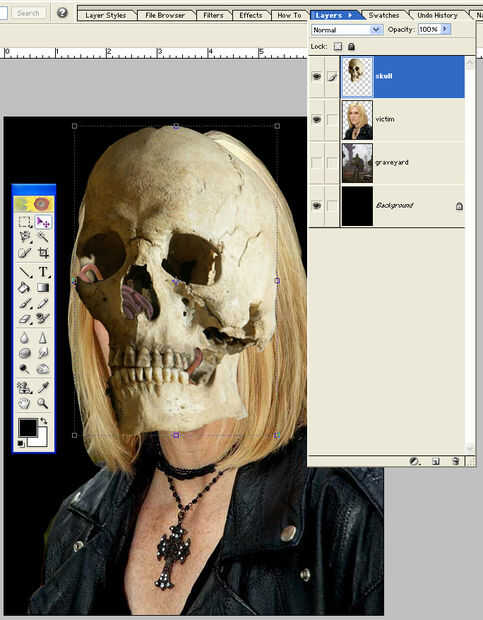 En capas haga clic y arrastre el cráneo por lo que es ahora por encima de la víctima. Luego utilizando la herramienta mover lo coloque directamente sobre la cabeza de la víctima. Usted tendrá que cambiar el tamaño lo, pero no te re particular sobre él porque te alineamos lo mejor como nos vaya.