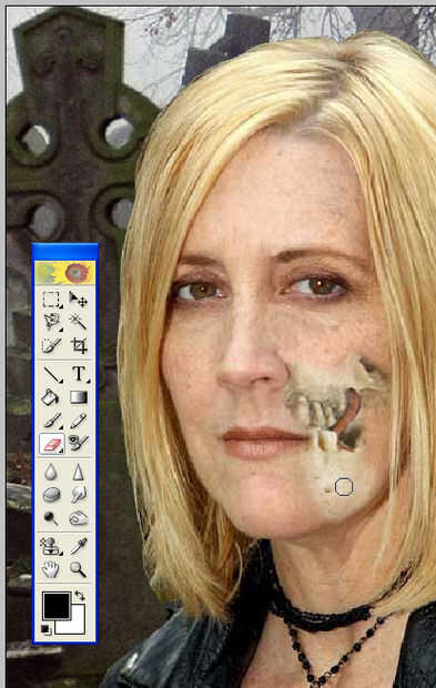 Utilizando la herramienta Borrador eliminar algunas de la mejilla de la víctima, hasta la esquina de la boca. Ahora podemos ver que el cráneo es todavía un poco apagado, pero nos podemos arreglar eso. Haga clic en el capa del cráneo en capas y con las teclas de flecha del teclado puede deslizar el cráneo por debajo de la capa de la víctima y alinee con la esquina de la boca.