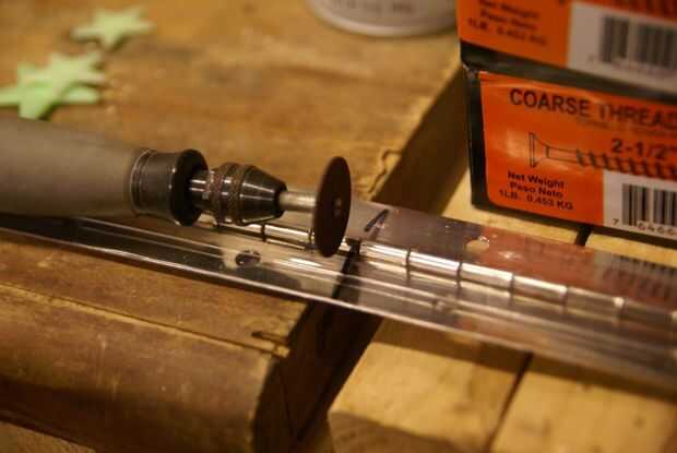 Estos 48" bisagras son grandes pero dos de ellos se redujo a 24." La mejor herramienta que tenía para esto era mi Dremel y una rueda de corte.  Era rápido pero un poco de un nusance ya que rompieron 3 cortar ruedas de hacerlo. ¿Alguien tiene alguna idea mejor?
