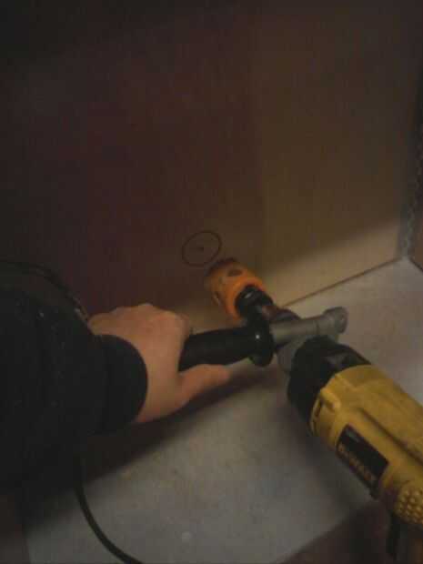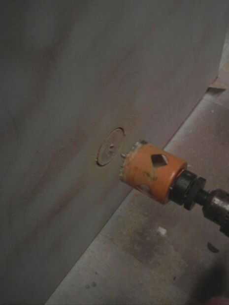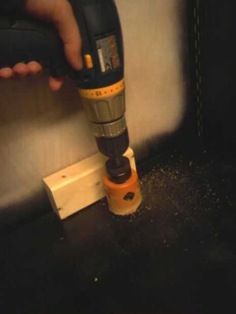 En el módulo de bloque de centro y la pared de la cabina cortar un agujero grande para enrutar los cables. Este tipo de broca deja un mejor acabado si perforar de un lado y luego taladrar desde el otro lado. De lo contrario puede agrietar la madera cuando llegas al otro lado.