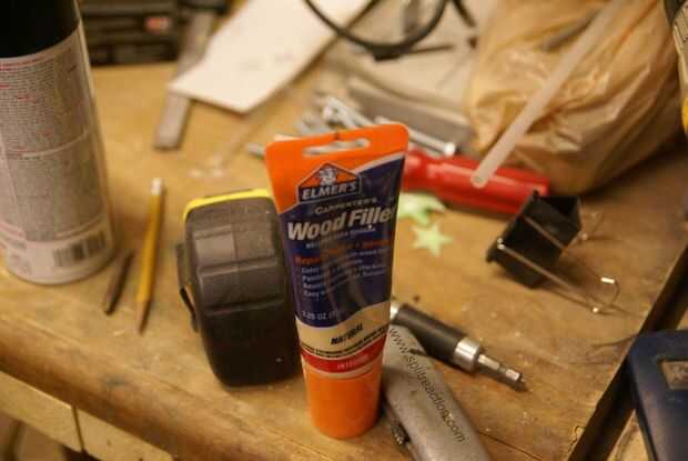 La madera tenía sorprendentemente pocos huecos. La mayoría de los que tenía que llenar fueron las diferencias entre los montantes de 2 x 3 y los orificios para tornillos que no quiero ver. Sólo usé alguna masilla de madera barato para hacer el truco.