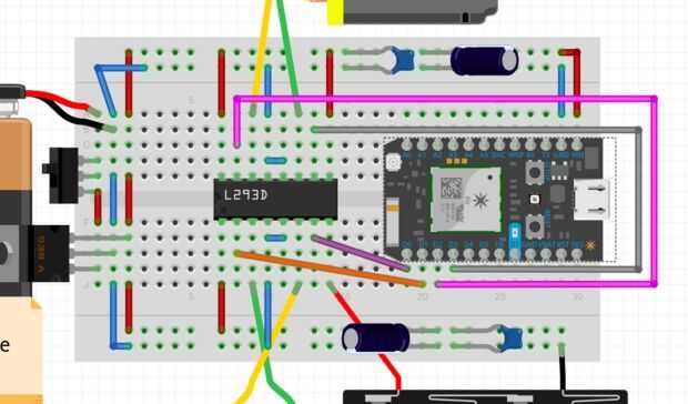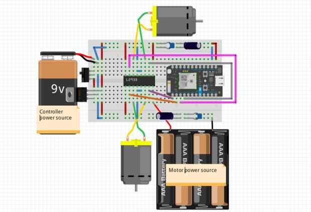 Ahora que estás lo suficientemente excitado acerca de las capacidades del fotón, vamos a comenzar este proyecto con la construcción electrónica del robot. He unido dibujos Fritzing del circuito y adjunta el archivo Fritzing para este paso. El circuito es bastante sencillo.