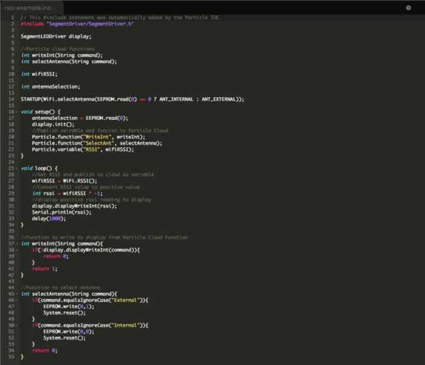 Haga clic en el icono blanco de la izquierda y asegúrese de que el módulo del fotón partícula está conectado y seleccionado aquí. Haga clic en el icono de las bibliotecas de la izquierda, luego buscar las bibliotecas de la comunidad SEGMENTDRIVER. Asegúrese de que está seleccionada la pestaña de RSSI_Expample.ino y luego en el uso de este botón de ejemplo. Ahora haga clic en el icono de dispositivos de la izquierda (aspecto objetivo) y asegúrese de que el controlador está en línea y seleccionado. Ahora haz clic en el botón Flash a la izquierda (similar a un perno del relámpago) para flash el firmware en el controlador.